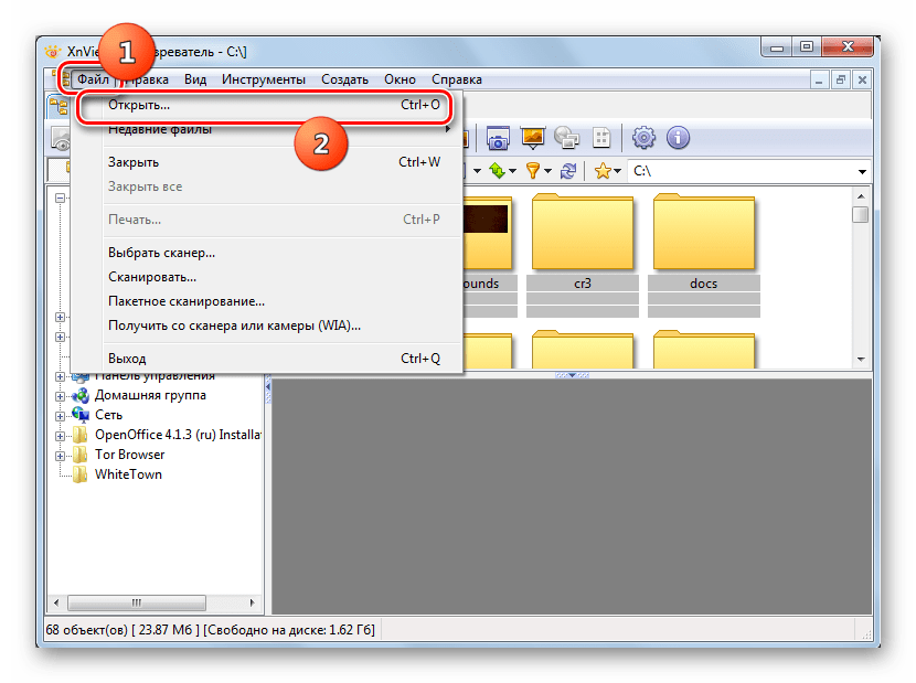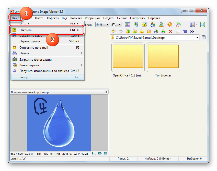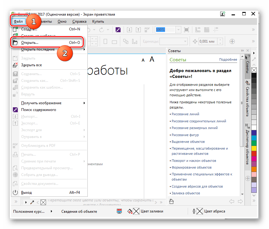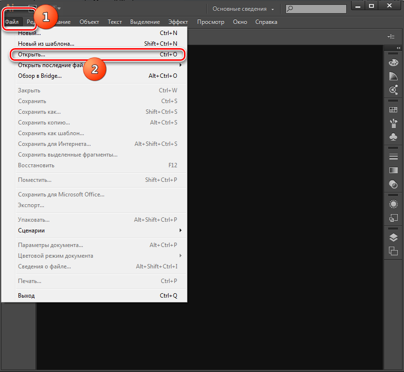 - В левом верхнем углу нажмите по пункту «Файл» и из выпадающего меню выберите «Открыть». Или используем горячие клавиши (жмем одновременно):