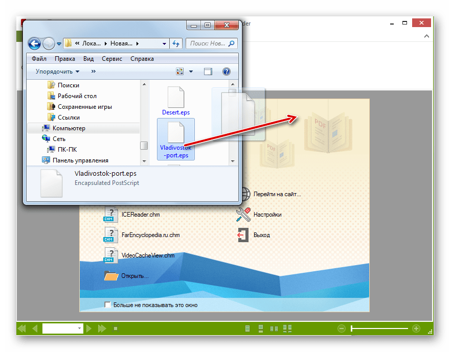 Также можно произвести открытие путем перетаскивания EPS в окно PDF Reader. В этом случае картинка откроется немедленно без всяких дополнительных окон.