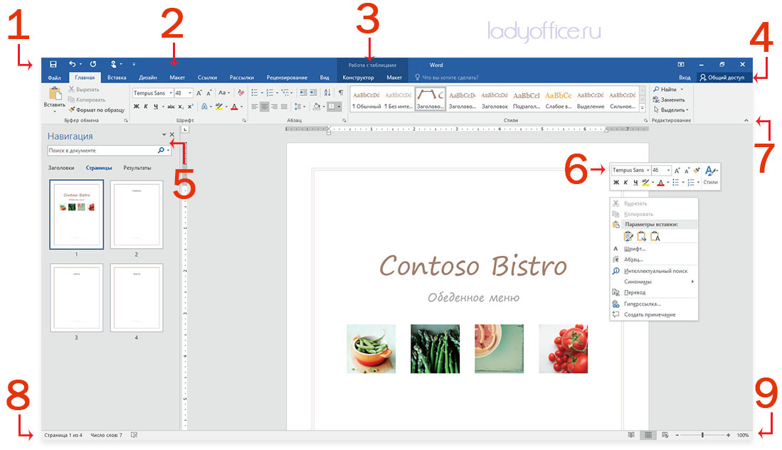 3.Контекстные команды. При выборе таблицы, рисунка или другого объекта в документе на экране появляются дополнительные вкладки.
