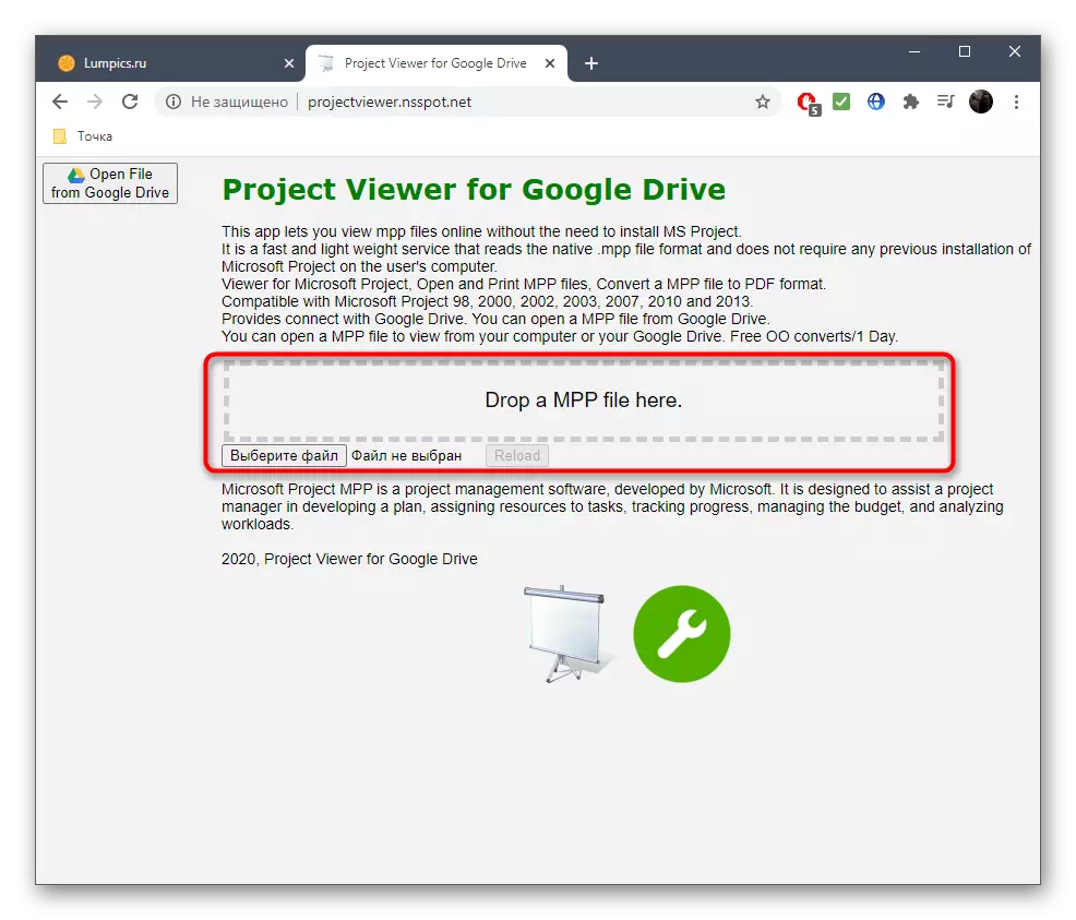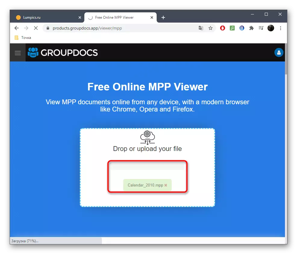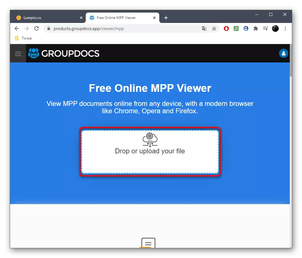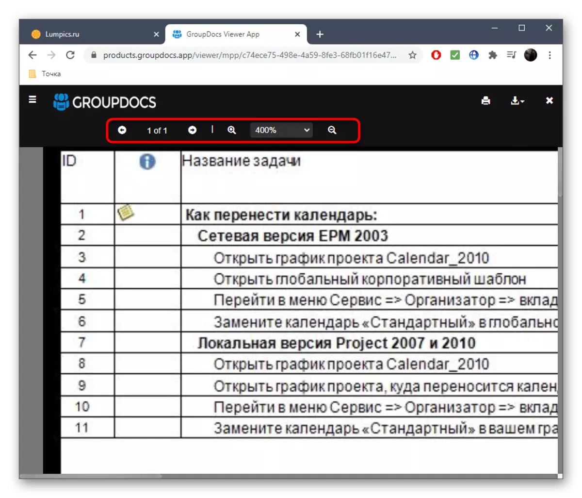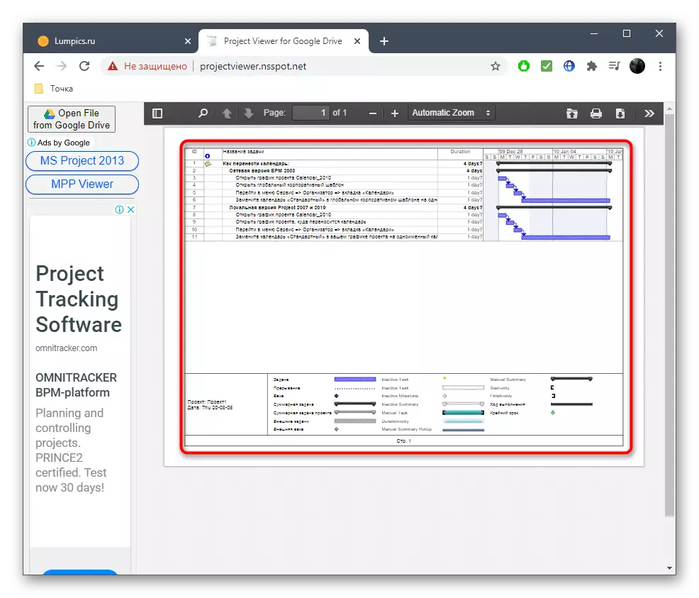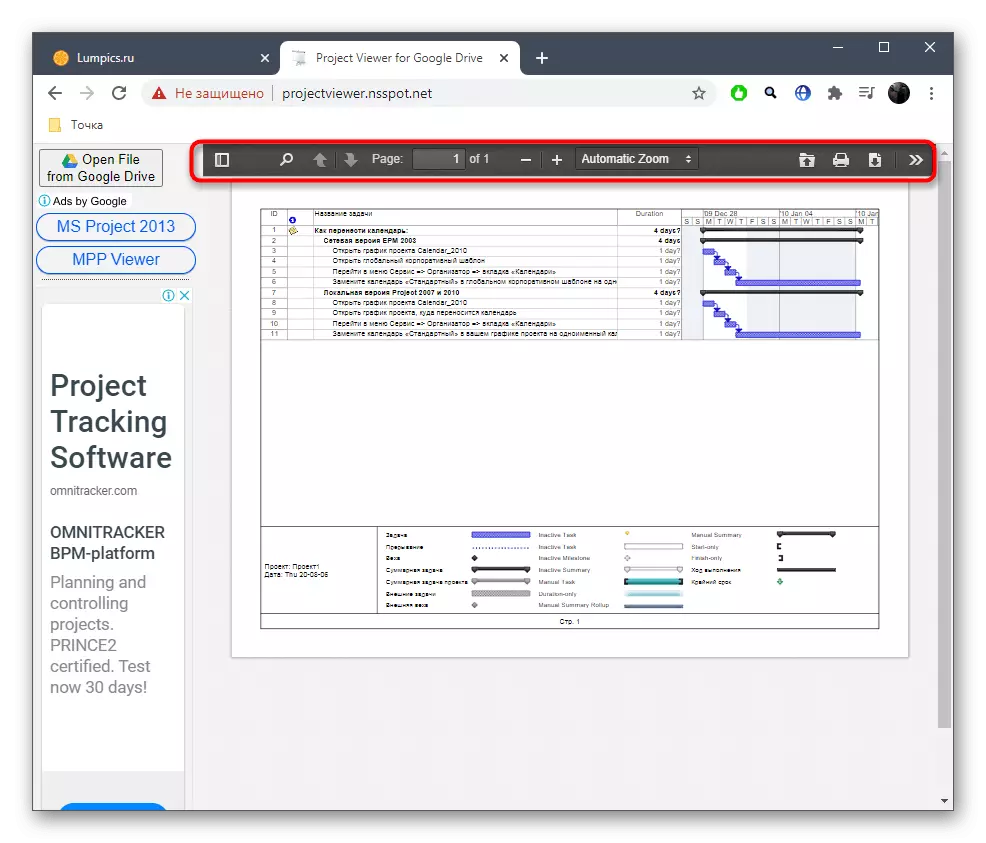 Online service called GroupDocs is designed to view a variety of files, including those that are in MPP format. It has additional tools that will be viewed comfortable, and will also allow you to save the project in PDF if it is necessary.