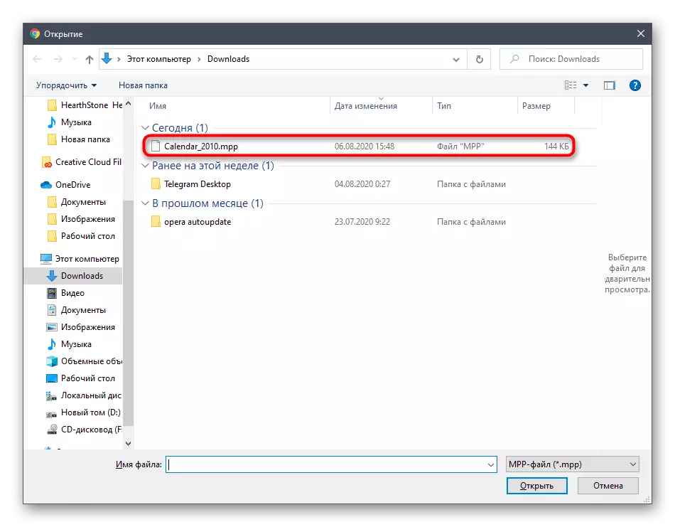 В диалоговом окне файлового менеджера проследуйте к директории, в которой находится нужный файл, выделите его и нажмите «Open». Подождите, пока документ загрузится в программу. По окончании загрузки проект в формате MPP будет открыт.