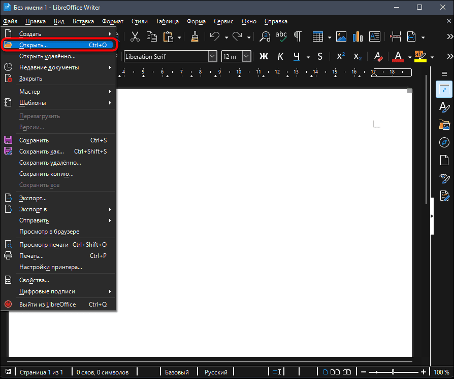 В LibreOffice поддерживается полная совместимость с форматом ODT, а также файл после редактирования можно будет сохранить в этом же формате без нарушения кодирования или форматирования. После запуска данного текстового редактора просто через меню «Файл» выберите пункт «Открыть», найдите документ рассматриваемого формата, загрузите его и приступайте к работе.