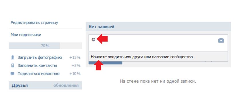 - После того, как поставили символ «@», появится небольшое новое поле с рекомендацией «Начните вводить имя друга или название сообщества».