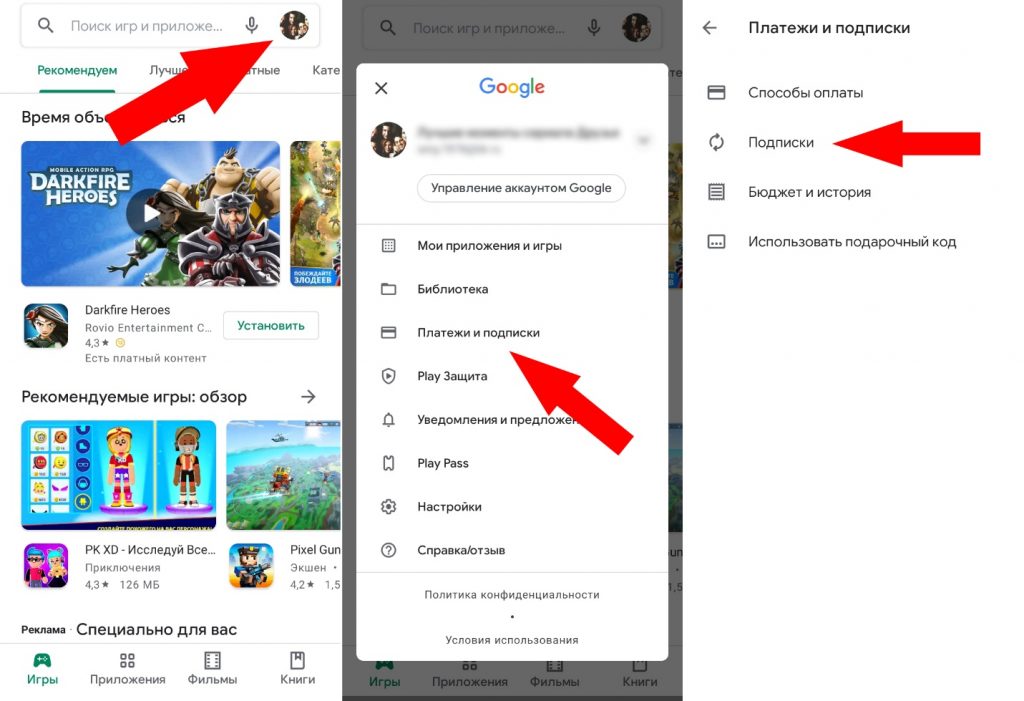 В первом случае необходимо запустить Play Маркет и авторизоваться в аккаунте, к которому прикреплена услуга. Далее нужно открыть меню программы, найти раздел с подписками, перейти в него и выключить автоматическое продление.