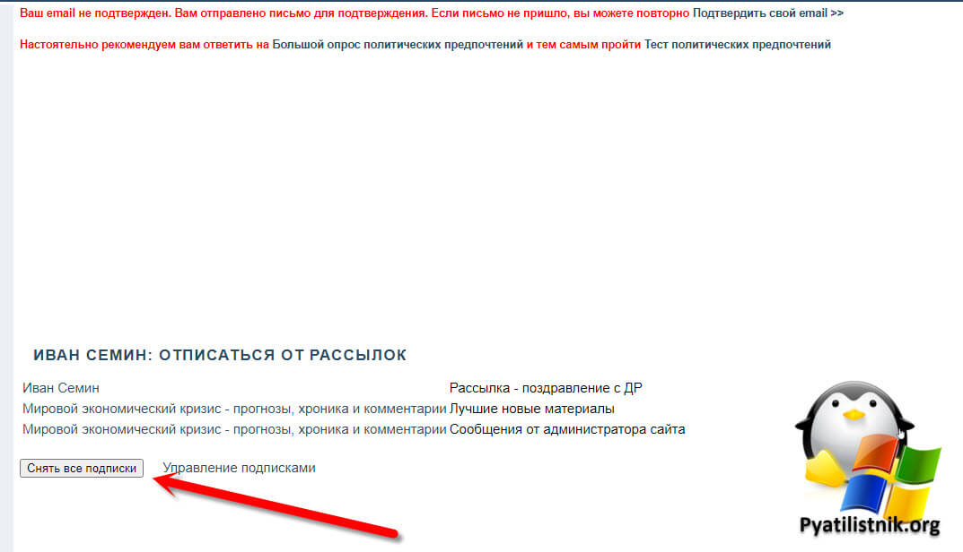 - Нажмите «Отписаться» напротив нужной рассылки.