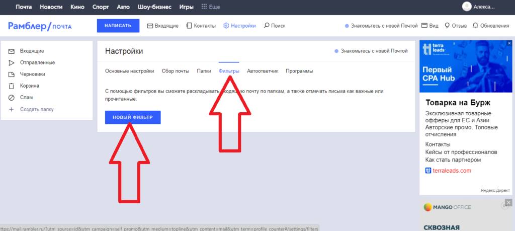 Откройте свой почтовый ящик и перейдите к настройкам (расположенным в правой части экрана). Перейдите на вкладку «Фильтры и заблокированные адреса» и нажмите «Создать новый фильтр».