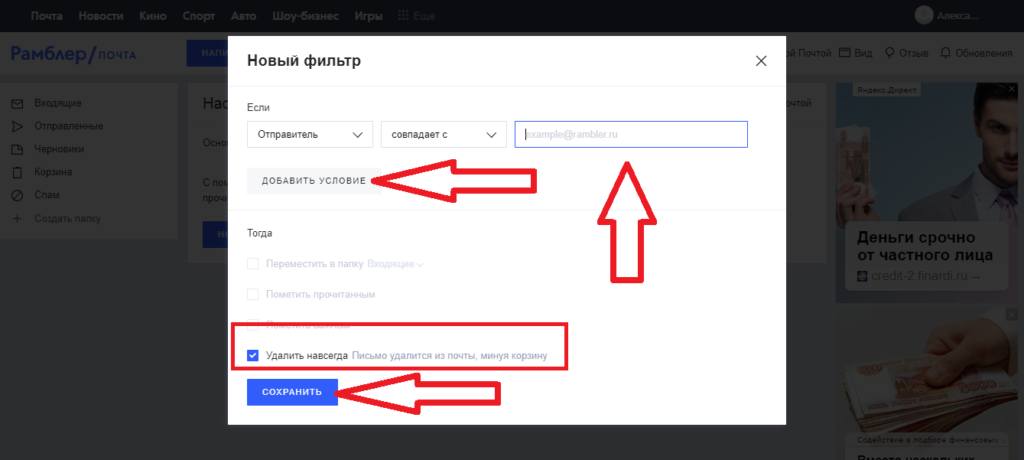 - В графе, «содержит», укажите е-мейл, от которого вы больше не хотите получать письма.