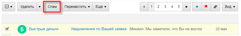 При отсутствии упомянутой выше ссылки вы можете воспользоваться кнопкой «Спам» на верхней панели инструментов. За счет этого вся цепочка писем, идущая от того же отправителя, будет расцениваться нежелательной и автоматически исключаться из «Входящих» сообщений.