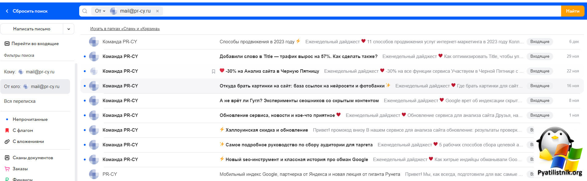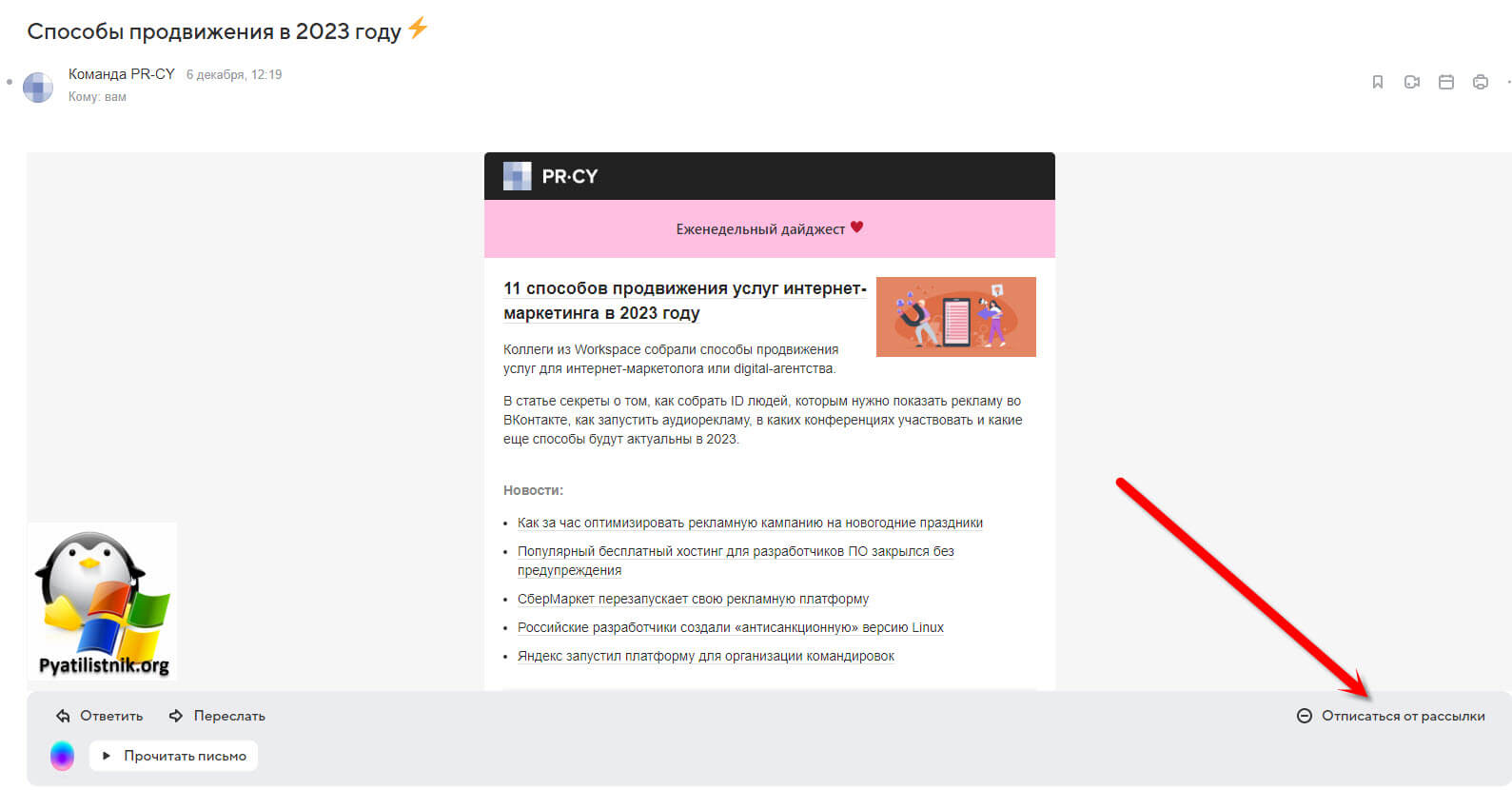 Теперь давайте посмотрим, как вы можете управлять рассылками на почтовом сервисе mailюru. Тут так же вы можете делать это точечно, либо массово. Предположим вам нужно отписаться от одной рассылки. В моем примере это будет сервис PR-CY. откройте любое письмо от данного сервиса.