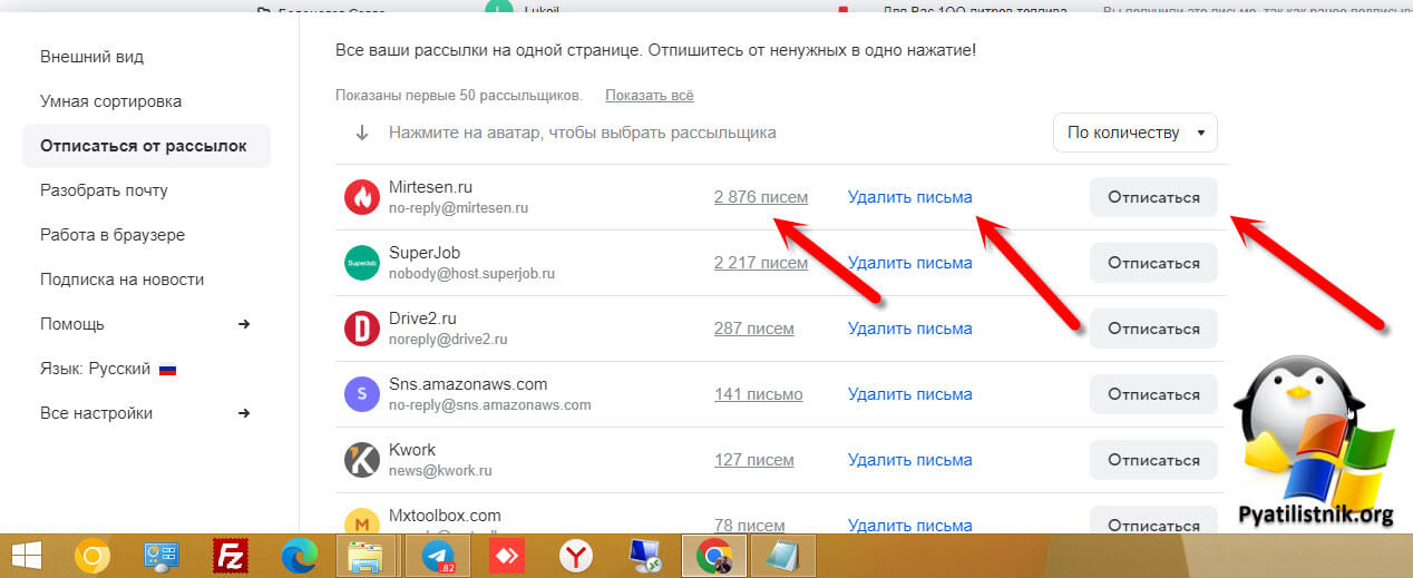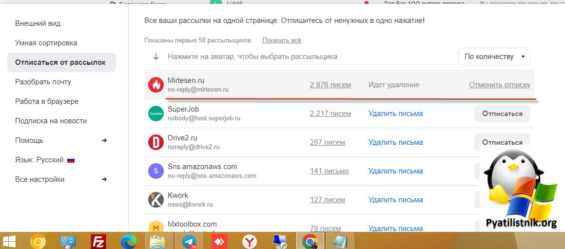 Я для примера удалю все письма от «Миртесен» и отпишусь от него. Для этого я нажимаю соответствующие кнопки.