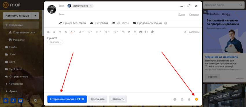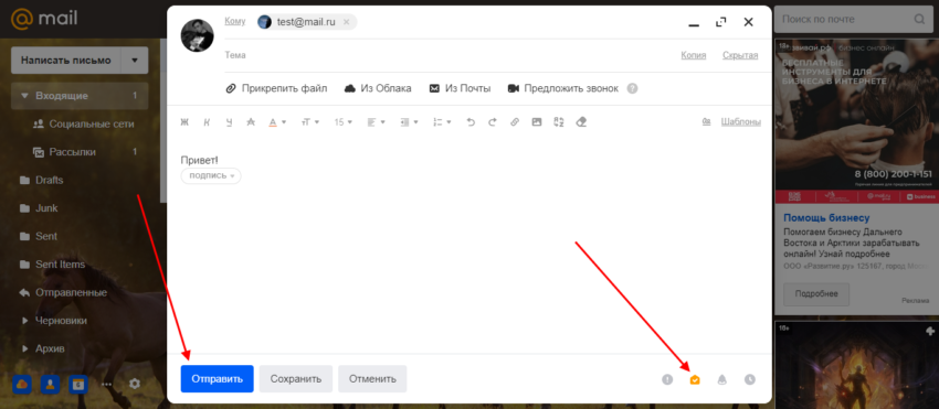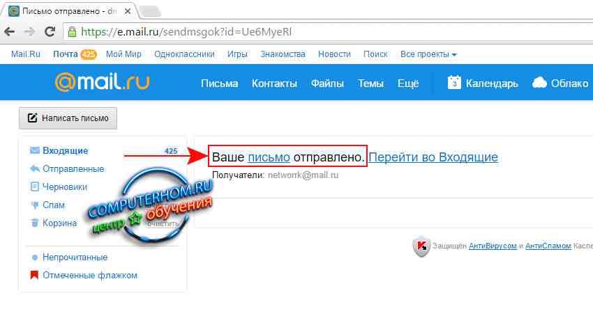 После этого сообщение с вложением уходит по указанному адресу. В ящике остается копия – она попадаем в папку «Отправленные».