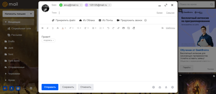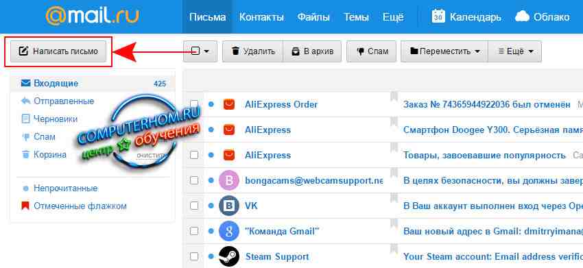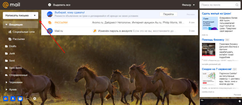 Это, пожалуй, самый простой способ из рассматриваемых сегодня. Если вы пользуетесь почтой от Google или Яндекс, то просто зайдите в свою почту и создайте новой письмо.