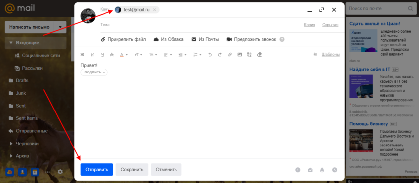 - Вверху в строку Кому добавьте адрес и нажмите на кнопку Отправить.