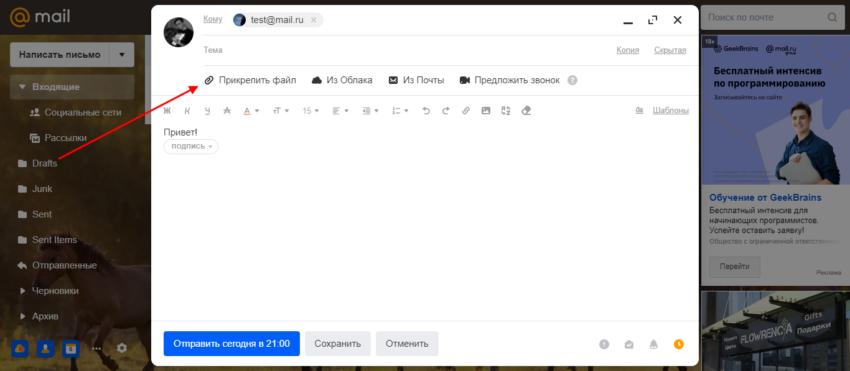 Как прикрепить к письму Майл ру файл, находящийся в Загрузках