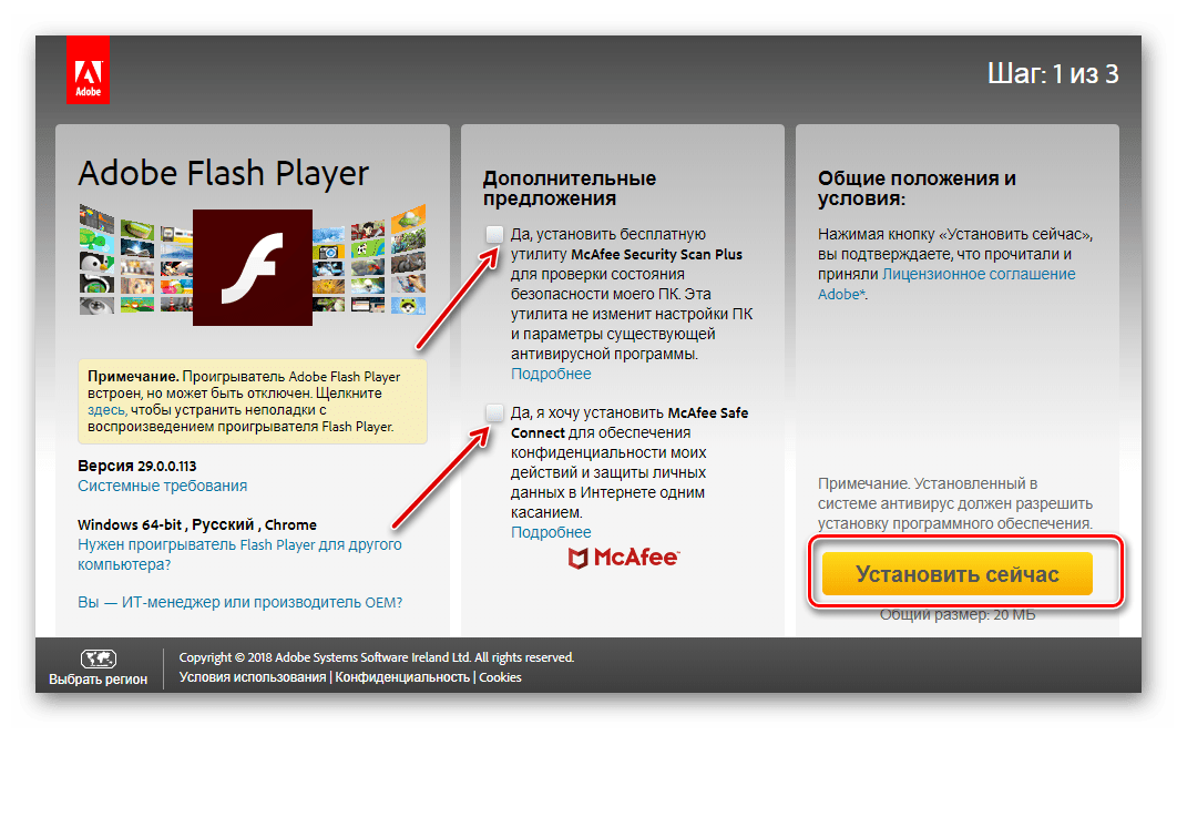 Система может предложить установить или обновить версию Adobe Flash Player. Безоговорочно соглашаемся.