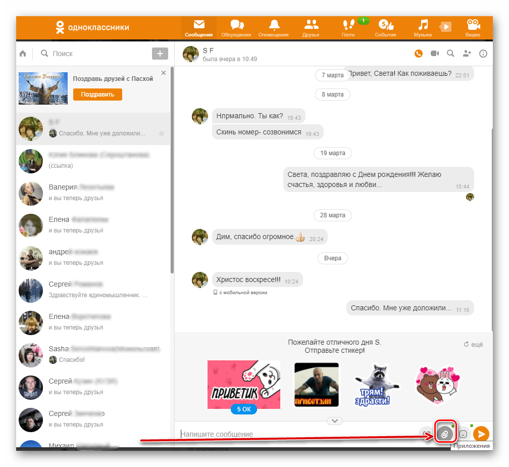 Одноклассники предоставляют возможность отправки в личных сообщениях различных файлов ( , фото и видео). Для этого предусмотрена кнопка с изображением скрепки. Нажав на неё, вы сможете выбрать необходимый файл.