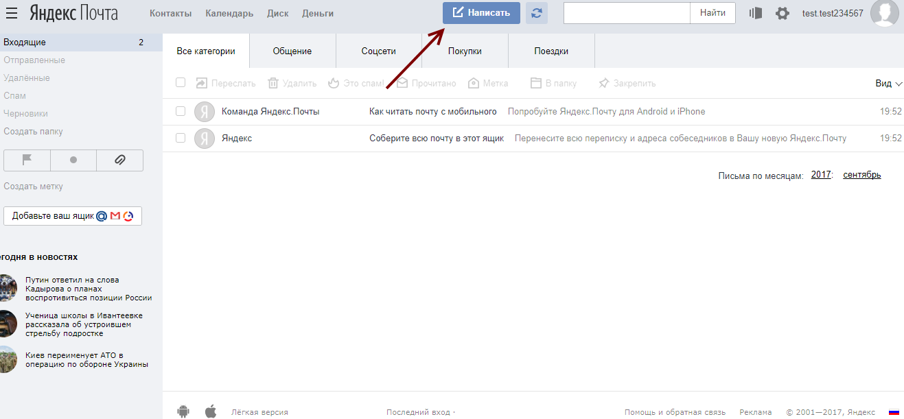 Чтобы отправить письмо по электронной почте, кликаем на кнопку Написать в верхней части экрана: