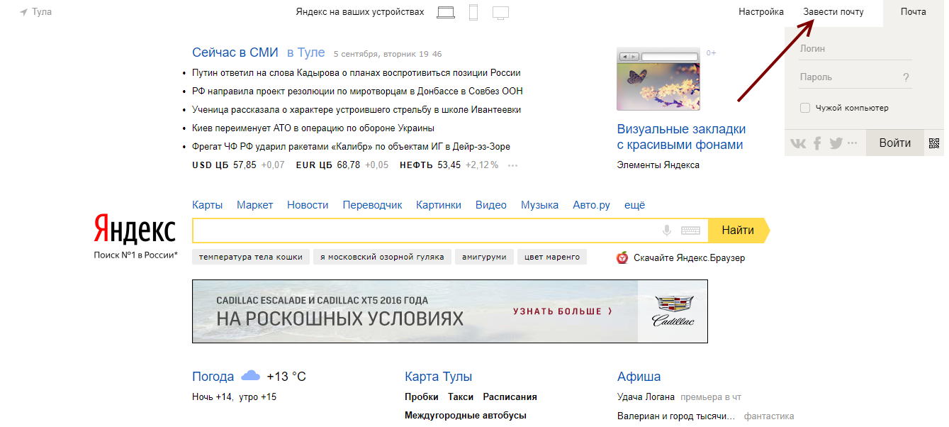 Чтобы зарегистрировать электронную почту на Яндексе, заходим на yandex.ru. В правом верхнем углу страницы будет блок «Почта». Нажимаем «Завести почту»: