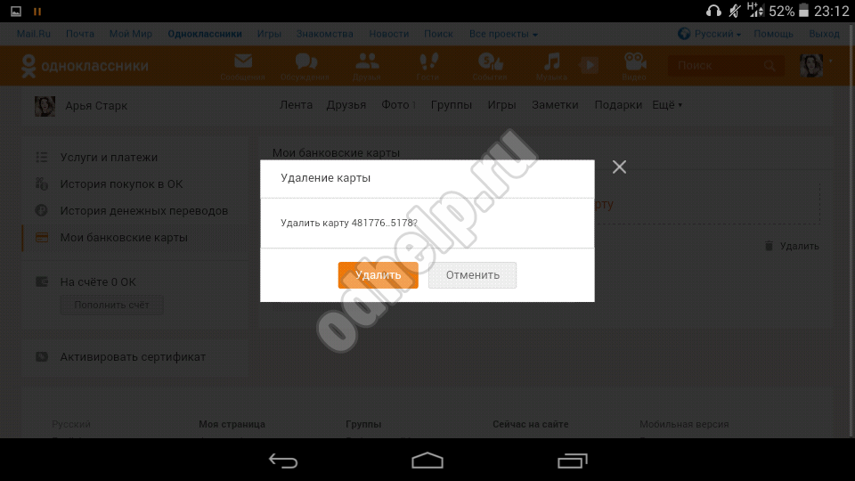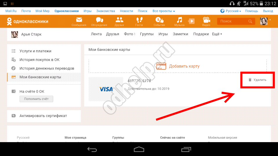 Как отвязать номер банковской карты от «Одноклассников» через телефон?