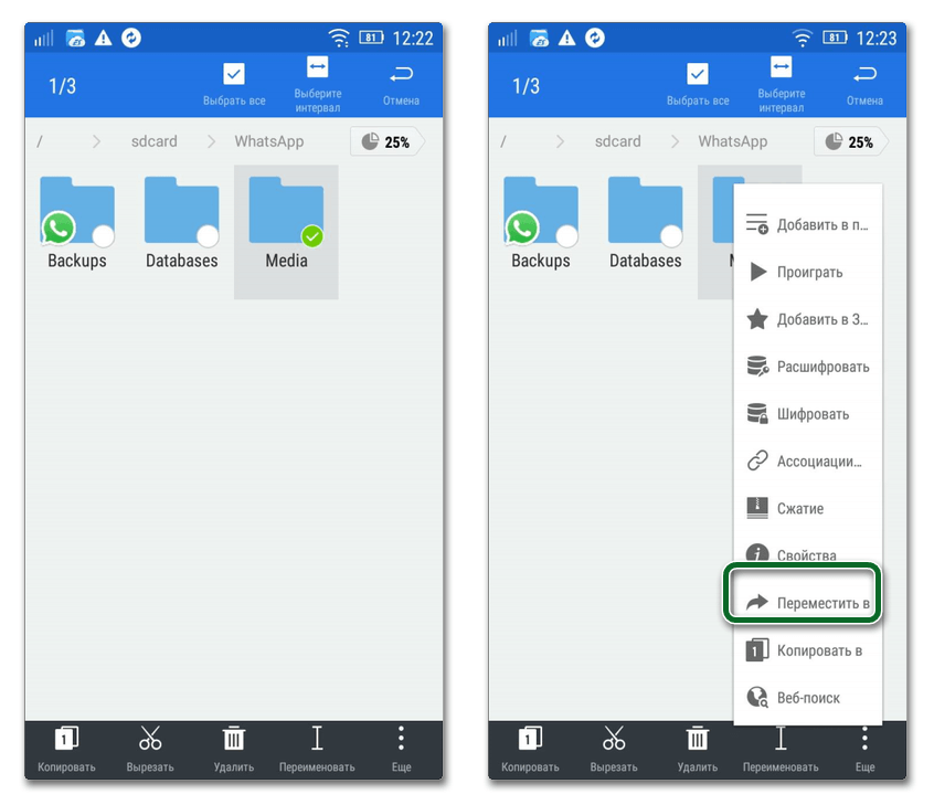 Мы разобрались с тем, как можно задать путь сохранения медиафайлов. Однако этого мало, ведь ваши старые файлы до сих пор хранятся во внутренней памяти. Если удалить их нельзя, можно осуществить перенос на SD-карту с помощью встроенной функции WhatsApp или через сторонние приложения.