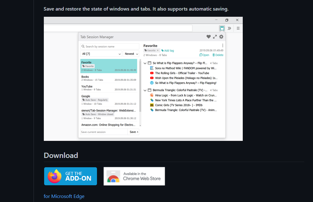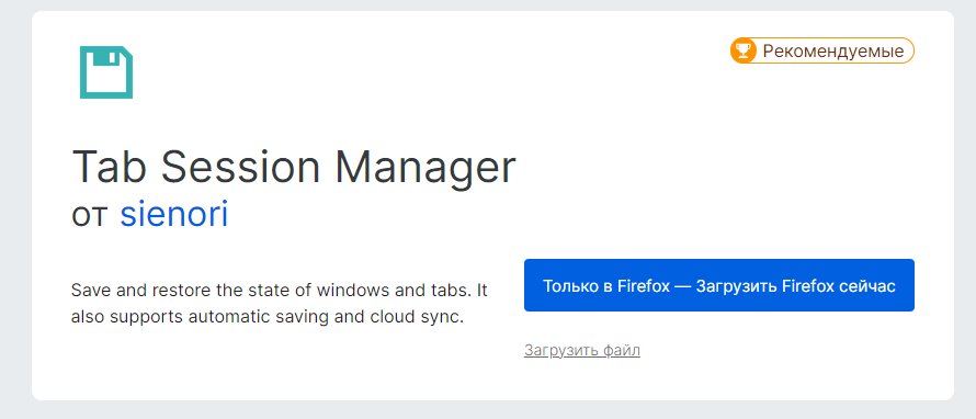 Tap Session Manager – это удобный плагин, позволяющий сохранять и восстанавливать состояние окон и вкладок браузера. Поддерживается возможность автоматического сохранения.
