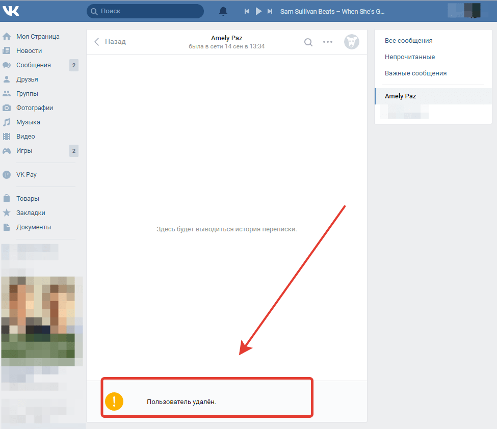 Я специально попробовал удалить переписку с пользователем, затем перешел к ней со страницы «Статистика»