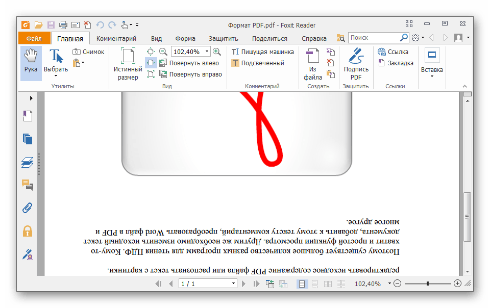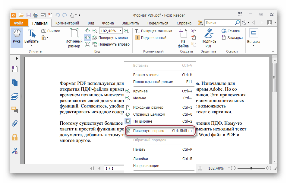 Аналогичный результат можно получить, кликнув по странице и нажав «Повернуть по часовой стрелке» или против. В отличие от Adobe Reader, здесь доступен поворот в обе стороны.