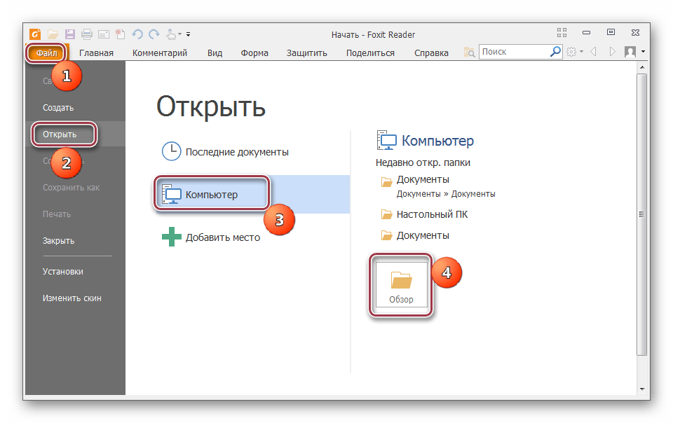 - Запускаем приложение и открываем исходный документ нажатием строки «Открыть»в меню «Файл». В открывшейся вкладке выбираем последовательно «Компьютер»и «Обзор».