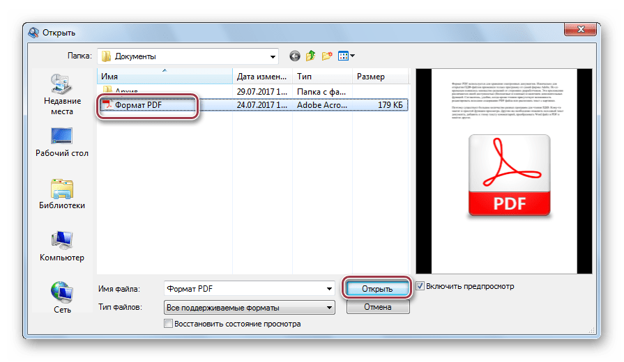 Открывается обозреватель папок, в котором сначала движемся к директории с необходимым PDF, а затем отмечаем его и жмем «Открыть».