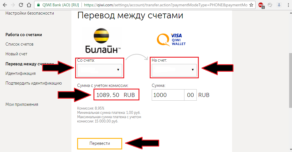 Укажите желаемую для перевода сумму и обратите внимание на комиссию, которая взимается за перевод. Для оператора «Билайн» она составляет 8.9% от перечисляемой суммы.