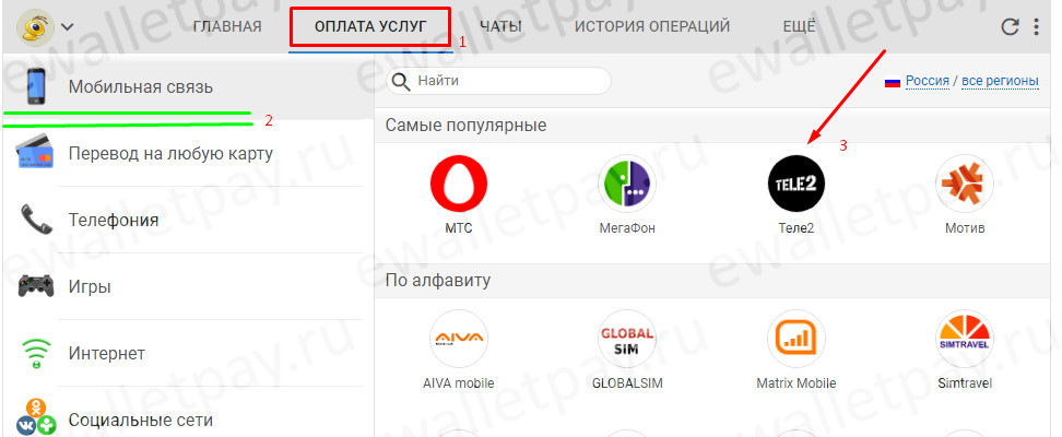 - В личном кабинете перейдите в раздел по оплате услуг (1) и укажите, что хотите пополнить мобильный телефон (2). Перед вами откроется окно с множеством телефонных операторов, как региональных, так и государственных (3).