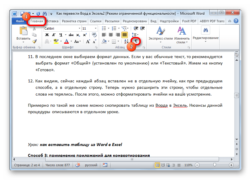 Существует ещё один способ конвертации данных из Ворда в Excel. Он, конечно, существенно сложнее предыдущего варианта, но, в то же время, подобный перенос зачастую более корректен.