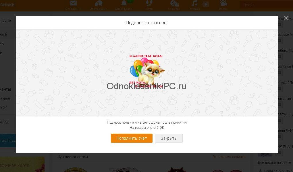 После этого останется перегрузить страницу Одноклассников, и попытаться вновь отправить подарок. Обычно в этом случае будет отображаться реклама, которую понадобится просмотреть, после чего вы сможете послать желаемый бесплатный подарок.