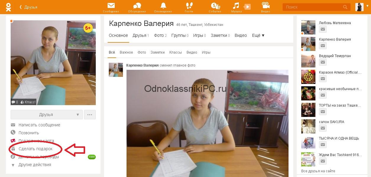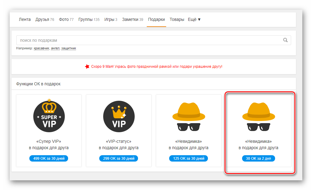 - отправляют подарки, приобретенные за «ОКи», другим пользователям сайта.