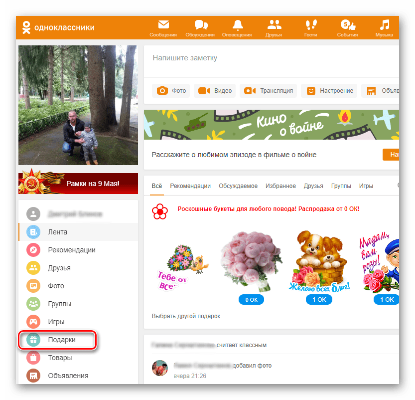 В социальной сети «Одноклассники» есть два основных способа отправления подарочных открыток пользователям, а именно: