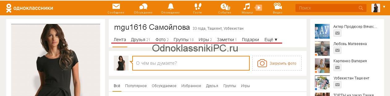 - Зайдите на свою страницу в сети Одноклассники и нажмите на вкладку Друзья, а затем (если сразу отображается друг) выберите и перейдите на страницу выбранного пользователя.