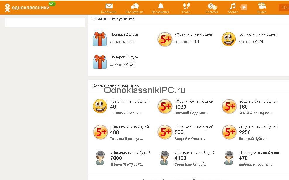 - Акции. Периодически на ресурсе проводятся акции, связанные с каким-либо событием (то есть проводиться только сегодня). Скидки могут длиться от одного часа до нескольких суток. В данный период можно купить подарки, которые обычно стоят несколько десятков ОК, все за 1-2 ОК.