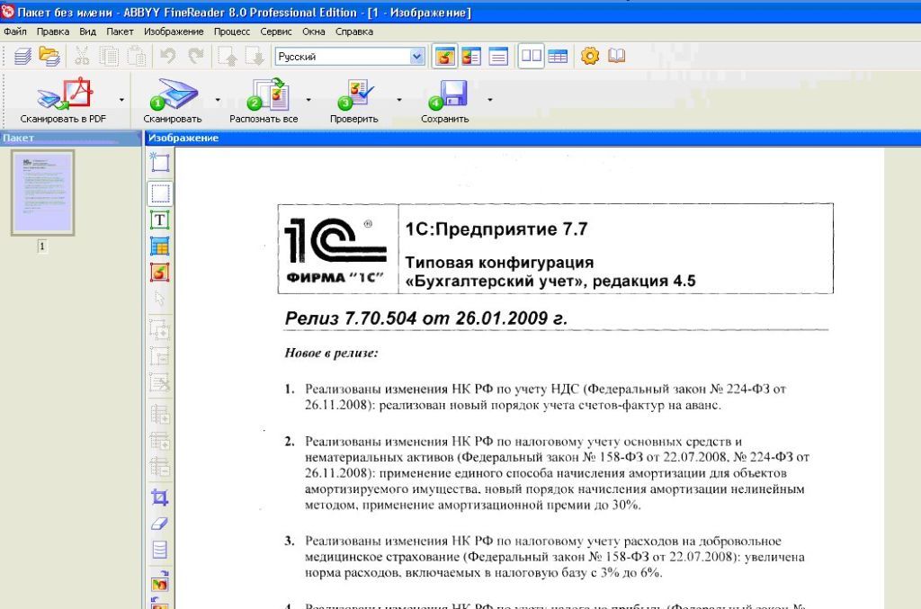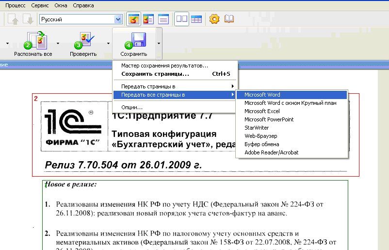 ABBYY FineReader представляет революционно новый подход к распознаванию документов. Теперь документ анализируется и обрабатывается целиком, а не постранично, что позволяет FineReader понять такие элементы его внутренней структуры, как верхние и нижние колонтитулы, сноски, подписи к картинкам и диаграммам, стили, шрифты и т.д. Элементы исходного документа восстанавливаются в результирующем документе. Например, при сохранении в Word верхние и нижние колонтитулы, сноски воспроизводятся как соответствующие объекты в Word.