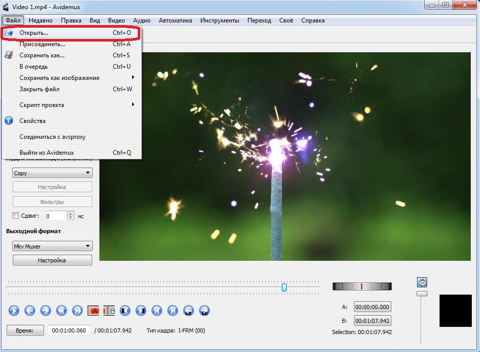 Чтобы открыть видео для редактирования, достаточно выбрать меню «Файл» -> «Открыть»: