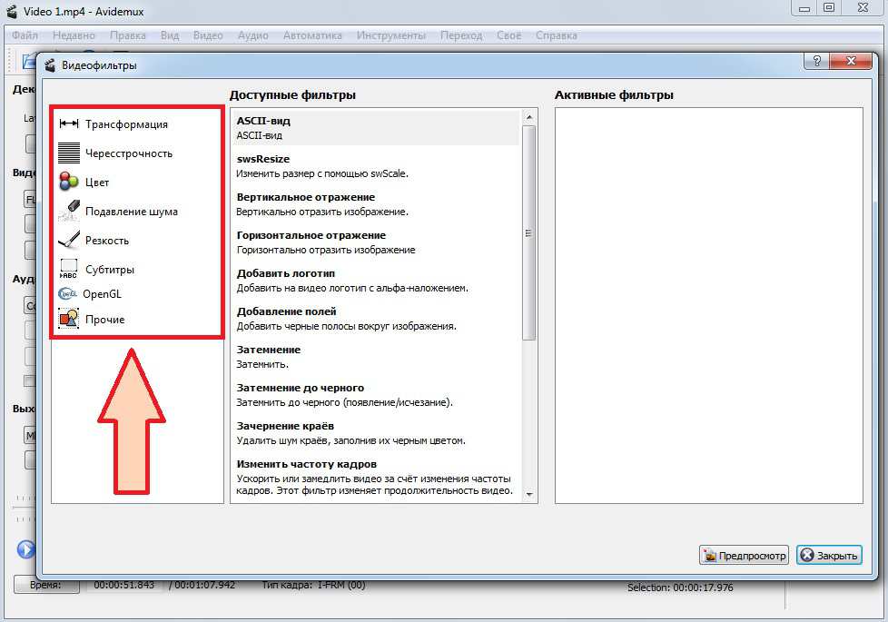 Одна из самых интересных возможностей Avidemux — это фильтры видео. Они позволяют применять различные эффекты к вашем видео, как в профессиональных редакторах. Например, вы можете уменьшить размер кадра, изменить FPS, повернуть видео и многое другое. Все они доступны из меню «Video» -> «Filters»: