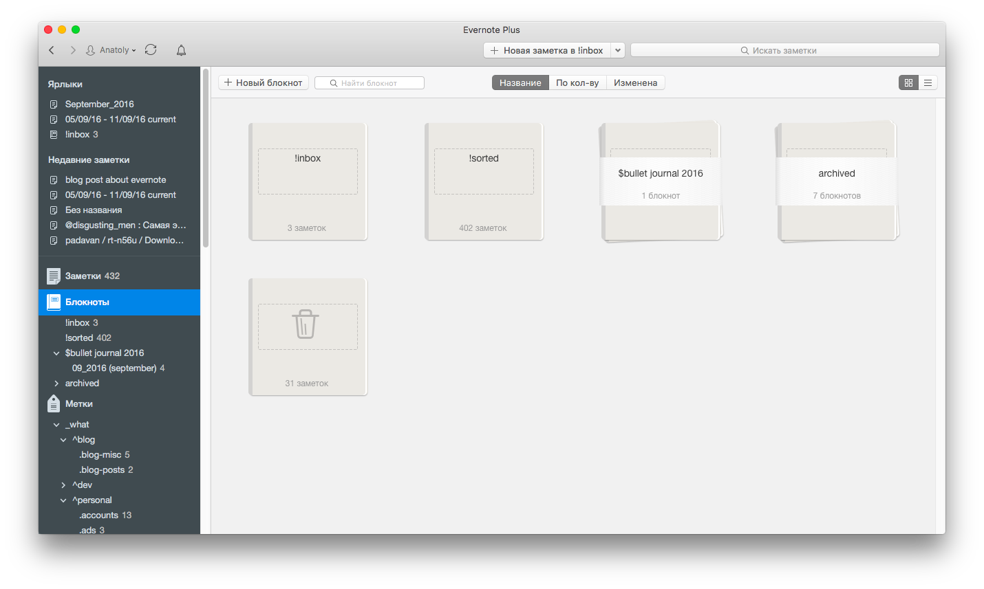 Не создавайте много блокнотов по типу: personal, dev, project_1, project_2 etc. Удобнее пользоваться тегами, хотя бы потому, что их можно бесконечно вкладывать в друг друга.