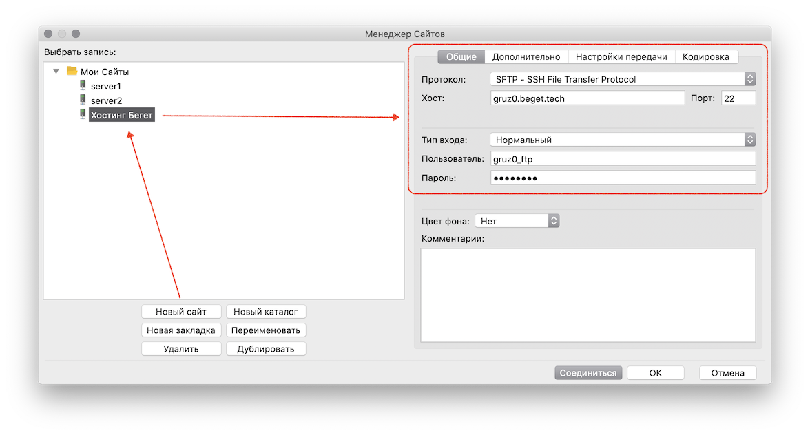 | Шаг 5 | Выберите протокол соединения. Обычно это FTP или SFTP. Если не уверены, уточните это у своего хостинг-провайдера. |