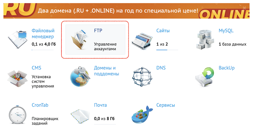 Для подключения к хостингу нам нужно получить логин, пароль и адрес сервера, которые можно взять в панели управления вашим хостингом. Где именно находятся эти данные зависит от выбранного хостинг-провайдера, некоторые высылают их письмом на вашу почту после регистрации, а где-то придётся залезть в настройки и активировать доступ к хостингу по FTP.