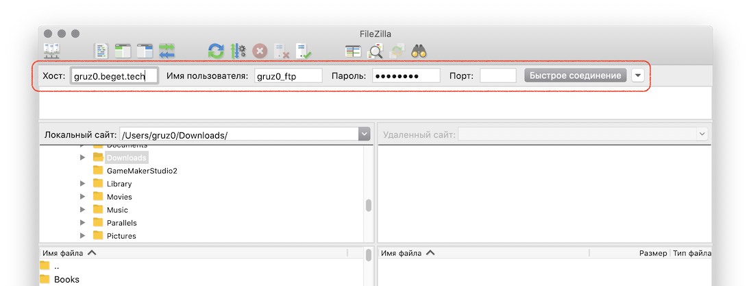 Теперь мы можем запустить FileZilla и в области быстрого подключения к серверу ввести имеющиеся у нас данные, а именно: хост (это адрес сервера), имя пользователя и пароль. Поле «Порт» оставляем пустым.