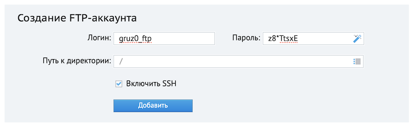 Придумываем имя пользователя и обязательно максимально сложный пароль (можно нажать кнопку справа от поля пароля для автоматического создания пароля). Поле «Путь к директории» оставляем без изменения, но вот настройку «Включить SSH» активируем. Нажимаем кнопку «Добавить».