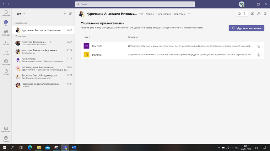 В чат можно добавлять различные встроенные приложения и использовать их при общении или совместной работе. Для этого перейдите в раздел «Управление приложениями» (рис. 4.1.3). Здесь вы можете удалять ненужные приложения и выбирать новые. Также в Teams можно найти краткую информацию о каждом из них.