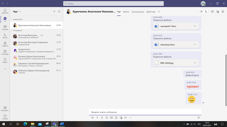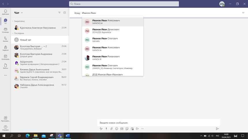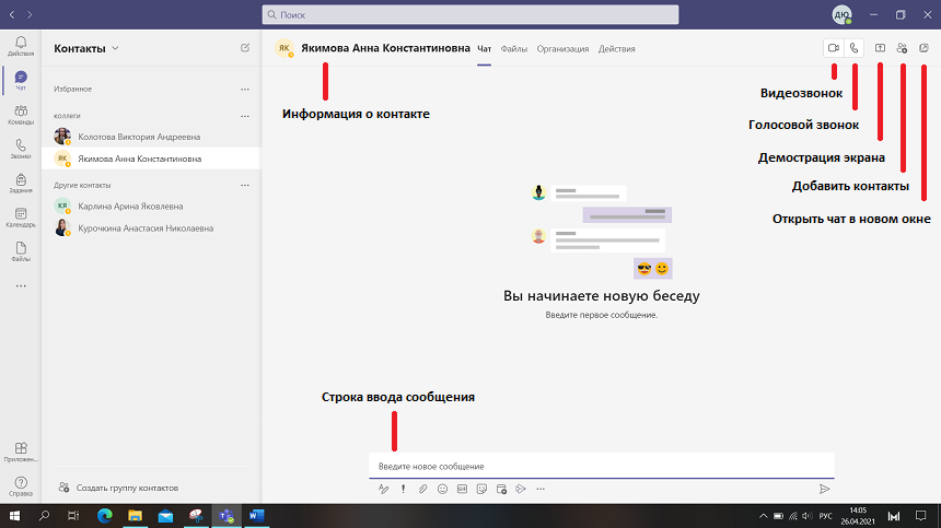 Начнем новый чат и рассмотрим все возможности, которые предоставляет MSTeamsдля организации общения (рис. 4.3.1).