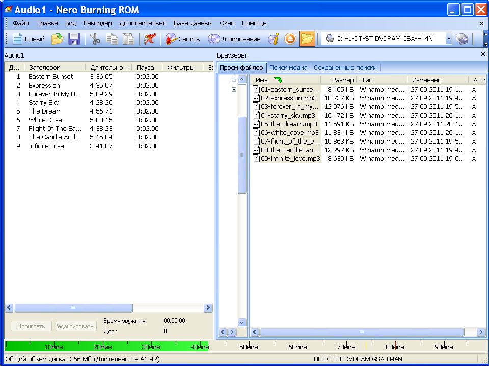 Все остальные действия не зависят от типа создаваемого диска. Используя прокручивающийся список, укажите программе путь к приводу. Выбирая аудиофайлы для записи, по шкале объема следите за наличием свободного места на диске.