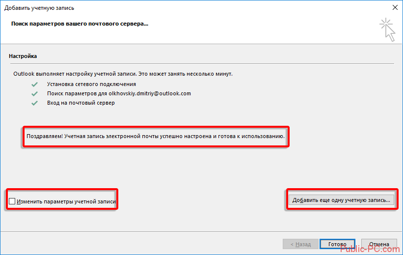 После успешной авторизации вы увидите сообщение «Поздравляем! …», также вам будет предложено зарегистрировать еще один почтовый ящик или же изменить параметры текущего (только что зарегистрированного). Теперь нажимаем кнопку «Готово».