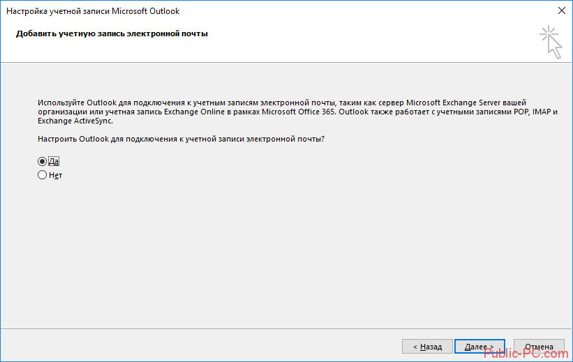 Первое что вы увидите при запуске- это окно, в котором вам будет предложено запустить программу предварительно подключив почту или же произвести запуск без подключения почтовых ящиков. В нашем случае мы будем подключать почтовый ящик, поэтому выбираем пункт «ДА» и нажимаем «Далее».